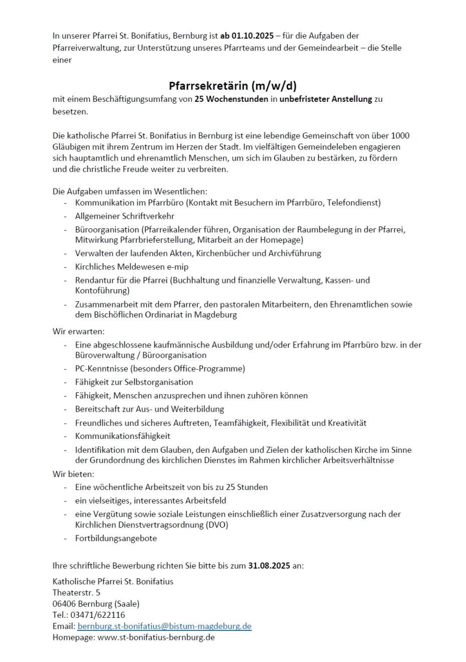 Stellenausschreibung Pfarrsekretärin - Katholische Gemeinde Bernburg