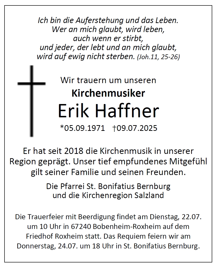 Traueranzeige Erik Haffner - Katholische Gemeinde Bernburg